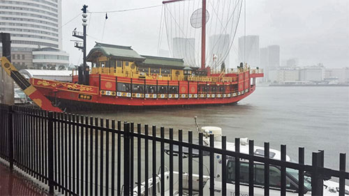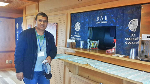 Oleh Penyelenggara pelatihan dari JICE yang menjemput segera membawa kami makan siang dan tour ke beberapa tempat. Tempat makan siang tergolong istimewa di atas Replika Kapal Shogun yang bernama Atakemaru. Kapal aselinya berjaya di perairan Jepang sekitar 370 tahun silam baik sebagai kapal penumpang maupun untuk tujuan militer.